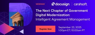 Attendee joined Docusign on September 23rd for an exclusive webinar on how Intelligent Agreement Management is moving the public sector beyond simple document storage to a proactive, data-driven approach. In addition, experts shared their perspective on what this digital transformation means for federal and state/local government agencies today and in the future.